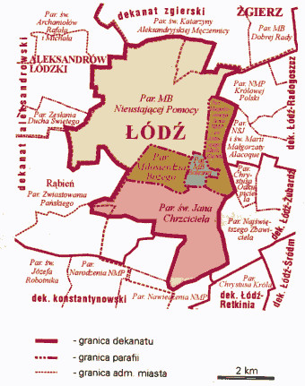 Od strony północnej: ul. Liściasta (strona południowa od ul. Chlebowej do torów kolejowych) Od strony wschodniej: Tory kolejowe (od ul. Liściastej do granicy parafii św. Jana Chrzciciela) Od strony południowej: Rzeka Bałutka od torów kolejowych do ul. Rabatkowej, ul. Rabatowa (strona północna od rzeki Bałutki do ul. Traktorowej) Od strony zachodniej: ul. Traktorowa (strona wschodnia od ul. Rabatowej do końca)